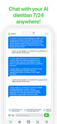 Не си сам в това пътешествие. С DietAI разполагаш със собствен виртуален диетолог, който предлага експертни съвети и персонализирани насоки. Открий богато разнообразие от здравословни ястия и леки закуски, съобразени с твоите хранителни нужди и вкусови предпочитания. DietAI не просто следи твоя хранителен режим, а те вдъхновява и учи как да постигнеш дълготрайни резултати, превръщайки здравословния избор в лесна и приятна част от ежедневието.