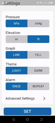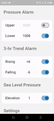 Персонализацията е в основата на потребителското изживяване. Задайте свои собствени прагове за аларма – както за горна, така и за долна граница на налягането, както и за бързи тричасови тенденции на покачване или спад. Можете да калибрирате приложението с точна стойност на надморската височина и да изберете предпочитаните мерни единици за налягане и височина. Освен това, разполагате с гъвкави опции за визуализация на графики и избор на тема, за да адаптирате интерфейса според вашия вкус. Дори честотата на повтаряне на звука за аларма може да бъде настроена, за да не пропускате нито едно важно изменение.