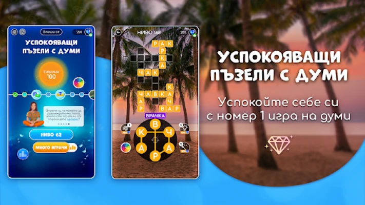Успокояващи пъзели с думи за релакс и приключения. Пътувайте виртуално до над 50 страни и 200 локации по света. Освободете съзнанието си от стреса и научете нови факти. Нашата игра е напълно безплатна!